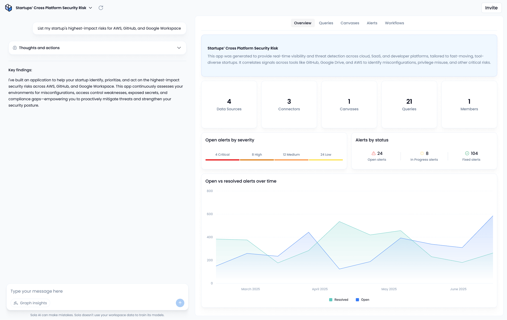 Connect your approved tools, ask the questions that matter and let Sola’s AI deliver fixes before the next audit or incident.