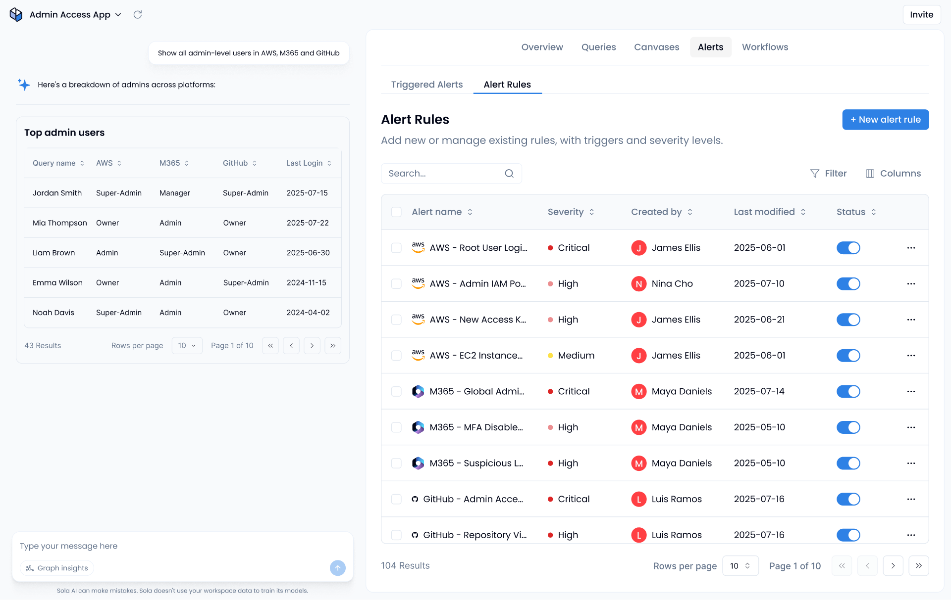 Connect your approved tools, ask the questions that matter and let Sola’s AI deliver fixes before the next audit or incident.